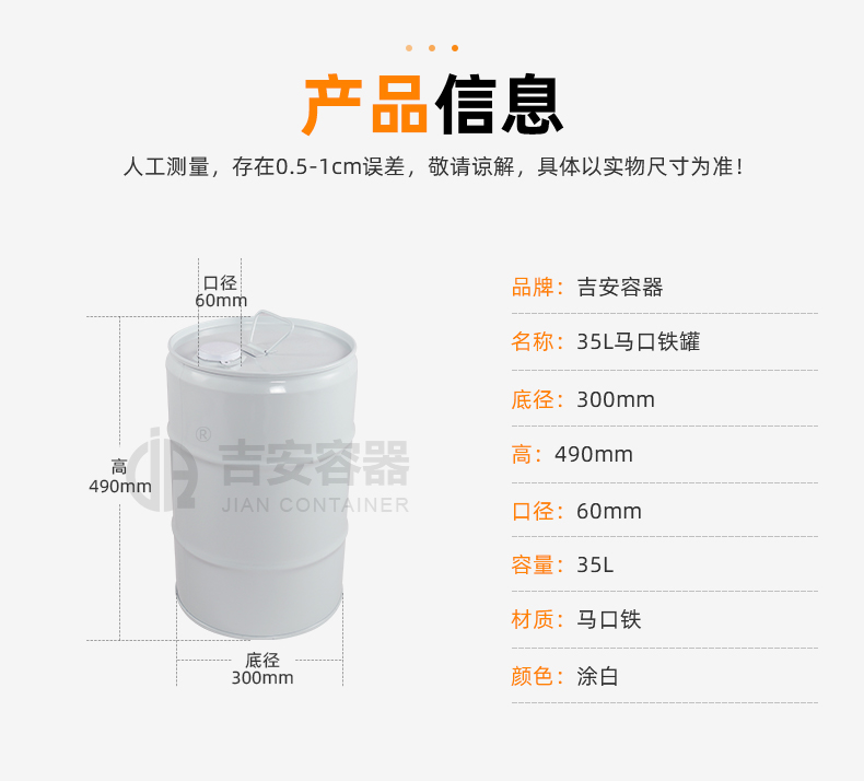 東莞市吉安包裝容器有限公司創(chuàng)立于2000年8月1日,是中國知名品牌企業(yè)。已通過ISO 9001質(zhì)量管理體系資質(zhì)認證,加入了中國中空協(xié)會,并獲得《中國知名品牌》,《國家標準合格產(chǎn)品》,《全國重合同守信用AAA級企業(yè)》,《質(zhì)量.服務(wù).誠信AAA企業(yè)》等榮譽稱號。根據(jù)材質(zhì)的不同,我們的產(chǎn)品分為塑料容器、鐵質(zhì)容器、鋁材容器、玻璃容器、紙質(zhì)容器等五大類。按產(chǎn)品的名稱分為塑料桶、塑料瓶、包裝桶、涂料桶、機油桶、油脂桶、化工罐、膠水瓶、鐵桶、鐵罐、鋁瓶、鋁罐、阻隔瓶、高阻隔瓶等,容量從3ML至1000L多種規(guī)格,多種款式。適合包裝的產(chǎn)品包括:化學(xué)試劑、化工原料、化工助劑、飼料添加劑、油墨、油漆、樹脂農(nóng)藥、日用化學(xué)品、聚氨脂、膠粘劑,廣泛應(yīng)用于化工、建筑、食品、醫(yī)療、生物等各領(lǐng)域。