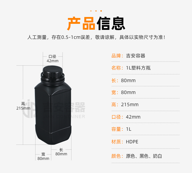 小口塑料瓶采用全新HDPE塑膠原料吹塑而成,具備韌性好、耐酸堿、耐腐蝕、不變形,密封性能佳等特點,可根據(jù)客戶需求定制、改色、產(chǎn)品適用于化工、清洗劑、醫(yī)藥、液體、食品、農(nóng)業(yè)等各行業(yè)包裝。