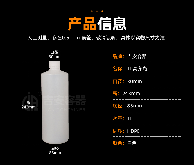 小口塑料瓶采用全新HDPE塑膠原料吹塑而成,具備韌性好、耐酸堿、耐腐蝕、不變形,密封性能佳等特點(diǎn),可根據(jù)客戶(hù)需求定制、改色、產(chǎn)品適用于化工、清洗劑、醫(yī)藥、液體、食品、農(nóng)業(yè)等各行業(yè)包裝。